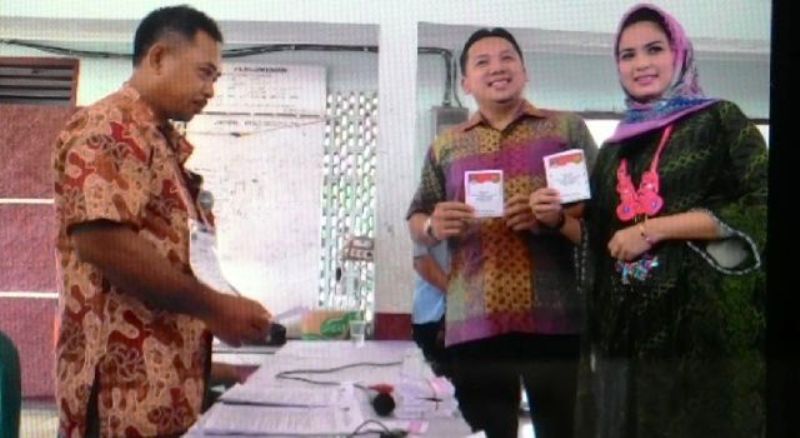 Gubernur Lampung M.Ridho Ficardo didampingi Istri Ny.Aprilani Yustin Ridho Ficardo saat mencoblos di TPS 07 Sumur Batu Teluk Betung Utara, pagi tadi Rabu 09 Desember 2015.