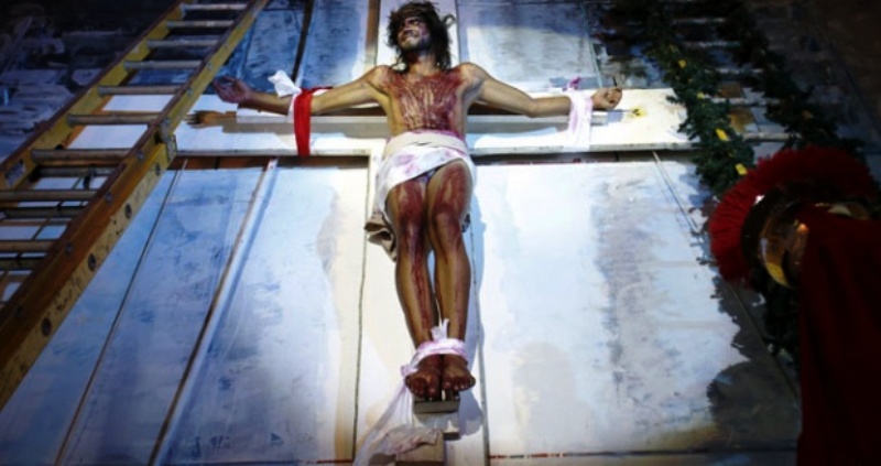 Seorang tahanan yang berperan sebagai Yesus disalib saat perpartisipasi dalam teater Yesus Superstar untuk menyambut hari raya Paskah di penjara Sarita Coloni, Callao, Peru, 22 Maret 2016. REUTERS/Janine Costa