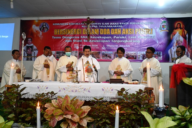 Rangkaian Temu Pengurus KKKI se-Keuskupan Tanjungkarang ini diawali dengan perayaan Ekaristi Kudus yang dipimpin langsung oleh Uskup Tanjungkarang, Mgr. Vinsensius Setiawan Triatmojo.***